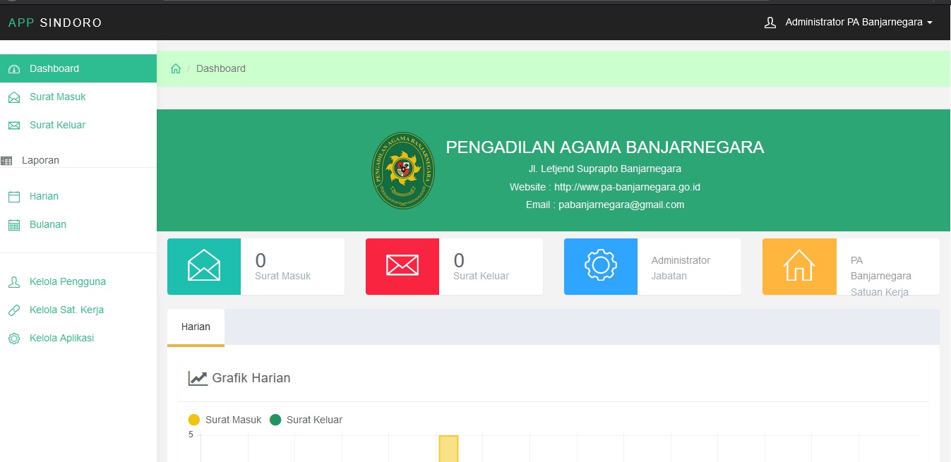 Untuk pengguna ini mempunyai akses penuh ke seluruh menu, namun dibatasi oleh Satuan Kerja, khususnya dalam pengelolaan pengguna, menghapus surat, dan edit surat.