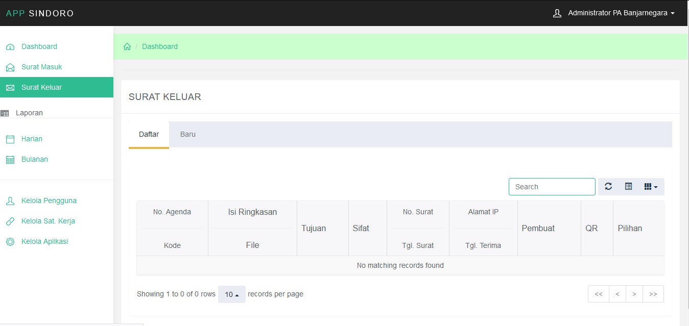 Menu Surat Keluar berisi data surat yang dikirim oleh SATKER pengguna ke SATKER lainnya.
