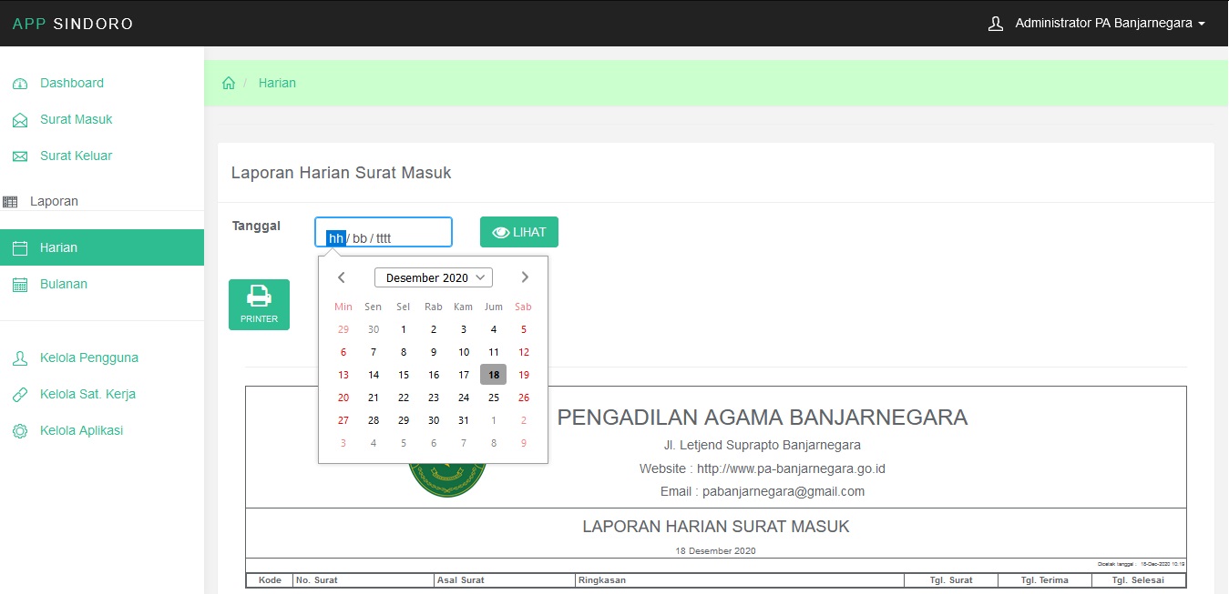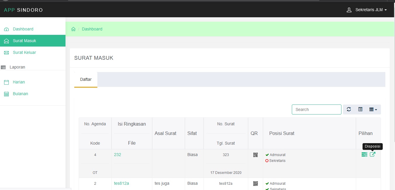 Menu Harian berisi rangkuman data harian surat masuk maupun surat keluar.