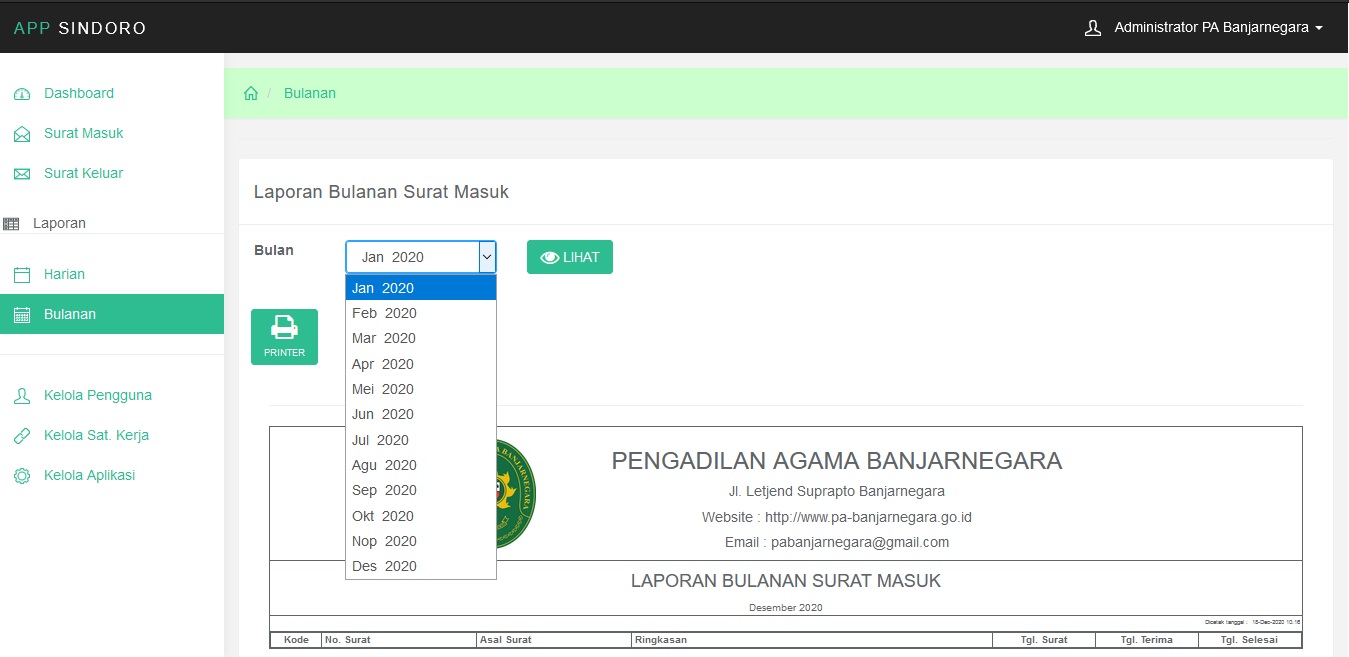Menu Bulanan berisi rangkuman data bulanan surat masuk maupun surat keluar.